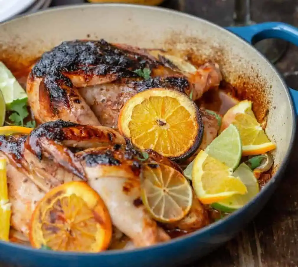 Мясо птицы для праздничного стола обычно это индейка, но если вы ищете что-то другое — менее традиционное, но столь же впечатляющее — эта курица с цитрусовым розмарином, чесноком и орегано.